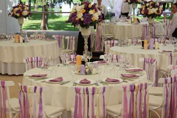 - Оформление белым цветом в сочетании с другими оттенками этого цвета. Это придаст помещению нежности, легкости и романтичности. Ткани в этом случае должны быть легкими. Лучше всего подойдут шифон, органза и вуаль. Столы и стулья можно задрапировать атласными тканями и бантами.