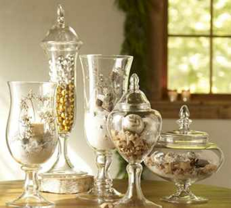 Столы украшают вазочками с наполнителями из цветного стекла, камней.