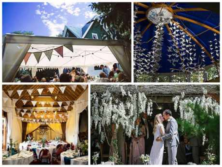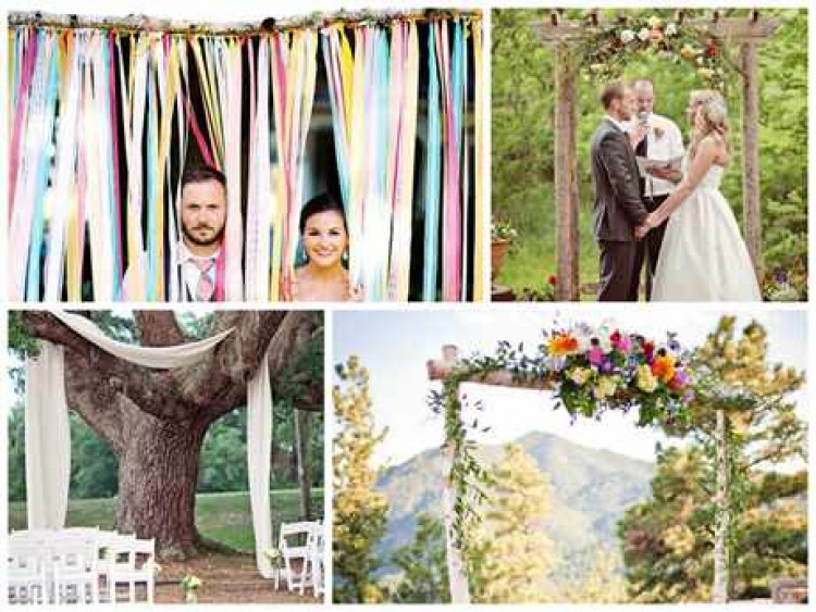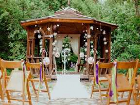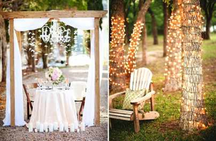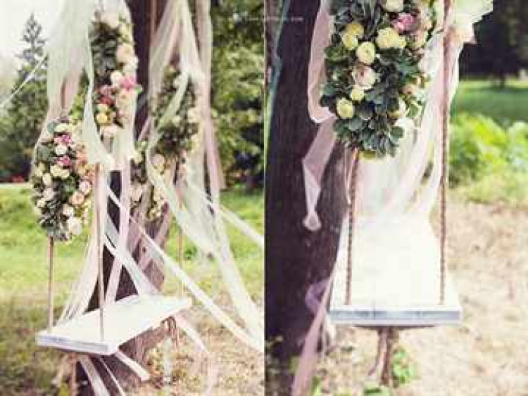 - Для торжественной части можно поставить шатер – чтобы уберечь новобрачных и гостей от палящих лучей солнца. Внутри шатра развешивают нити с флажками, ставят большие напольные вазы с цветами. Можно повесить бумажные фонарики, сердечки, перья, клеточки с птицами или без них, фотографии. Модным стало использовать маленькие деревянные прищепки, чтобы создавать небольшие композиции. Например, на нитях подвешивают на прищепки фотоисторию новобрачных.