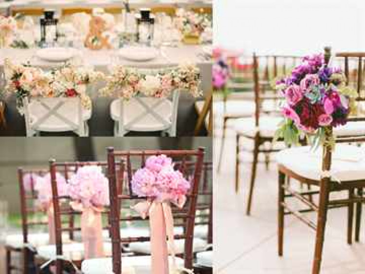 - Стулья обвязывают прозрачными лентами в тон свадьбы, добавляя искусственные или свежие бутоны. Дорожку часто посыпают лепестками цветов.