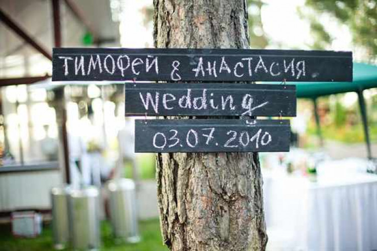 - Указатели на зоны летнего свадебного праздника обычно выполнены из дерева. Изюминки добавляют аксессуары типа ведерка с цветами, свечки.