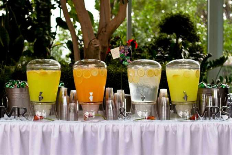 Если на летней свадьбе ставятся фуршетные столы, то для их украшения используют цветы, вазы со льдом, забавные указатели блюд, бумажные зонтики для оформления коктейлей. Обычно не останавливаются на одном цвете при декорировании фуршетного стола. Сладкий стол украшают разноцветными кап-кейками. Необычный стол с напитками – чугунная ванна, наполненная крупными кусками льда и бутылками со спиртным.