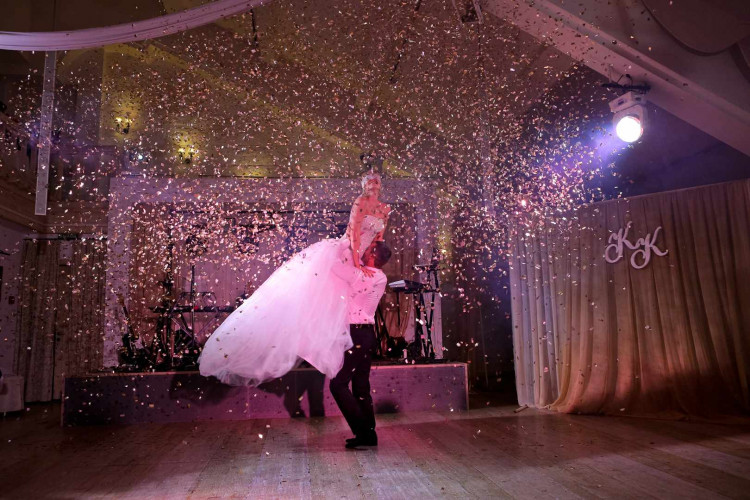 Танцевальную площадку украшают гирляндами из лампочек – вечером получается волшебный эффект от светящихся нитей. Можно подвесить красивую люстру, хрустальные игрушки, крутящийся зеркальный шар.