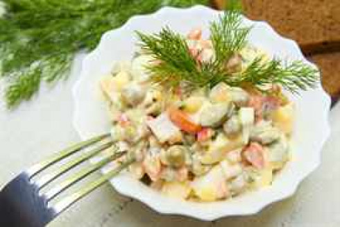 Предварительно варим яйца, картофель и морковь. Даем им остыть. Затем нарезаем все кубиками, включая соленые огурцы. Перемешиваем все ингредиенты, добавляя зеленый горошек, и заправляем все майонезом. Солим по вкусу.