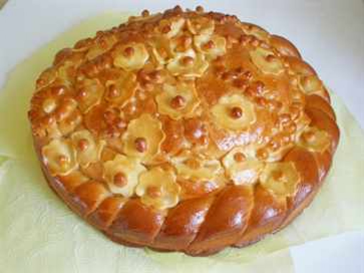Тесто нужно месить в течение 20 минут, чтобы хорошенько вымесить. Нет необходимости оставлять его подыматься, та как оно подходит уже во время замеса. Поделите получившуюся массу на две части. Одну часть скатайте в колобок. Выложите его на противень, застеленный бумагой для выпечки, в специальную круглую формочку без дна. Вторую часть нужно еще раз поделить на пару частей: для косичек и украшений. Сделайте жгуты и сплетите их в косичку. Смажьте основу пирога водой и украсьте его косичкой, закрепив её по кругу. Повторите это и со второй косичкой, а также добавьте украшений из теста на ваш вкус.